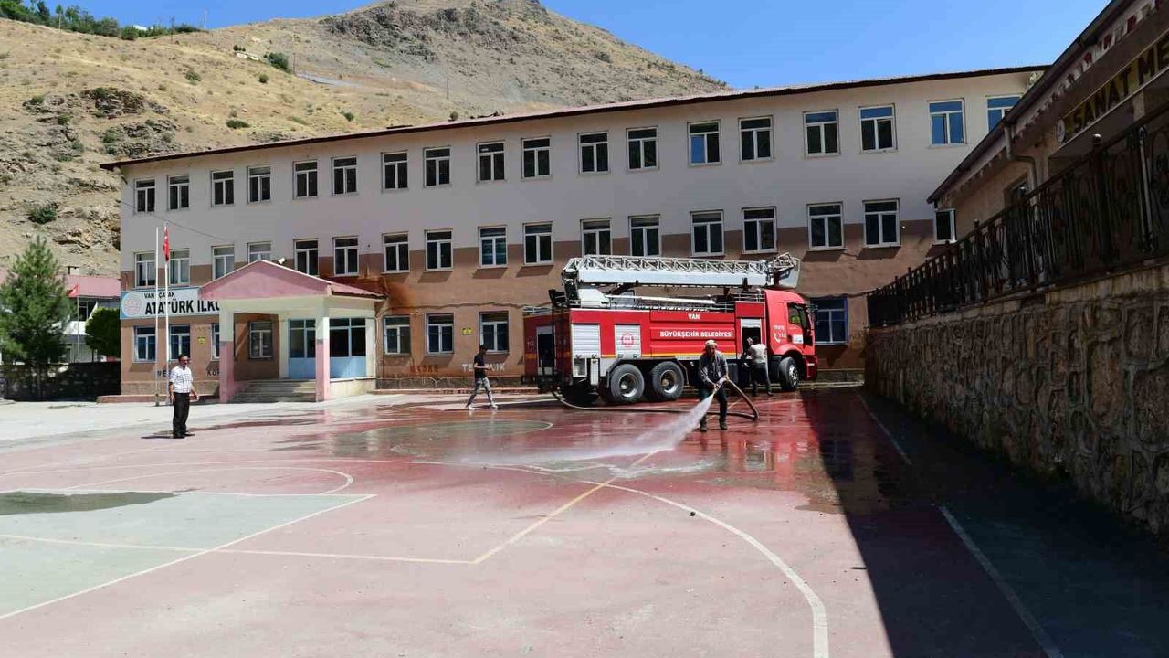 Çatak Belediyesi yeni eğitim öğretim yılı öncesinde okul bahçelerinde temizlik seferberliği başlattı. Öğrencilerin daha hijyenik ve sağlıklı bir ortamda eğitime başlaması için çalışma başlatan Çatak Belediyesi Fen İşleri Müdürlüğü ve Çatak İtfaiye Şefliği ekipleri, okul bahçelerini bir yandan yıkarken bir yandan da bahçede oluşan yabani otları temizledi.