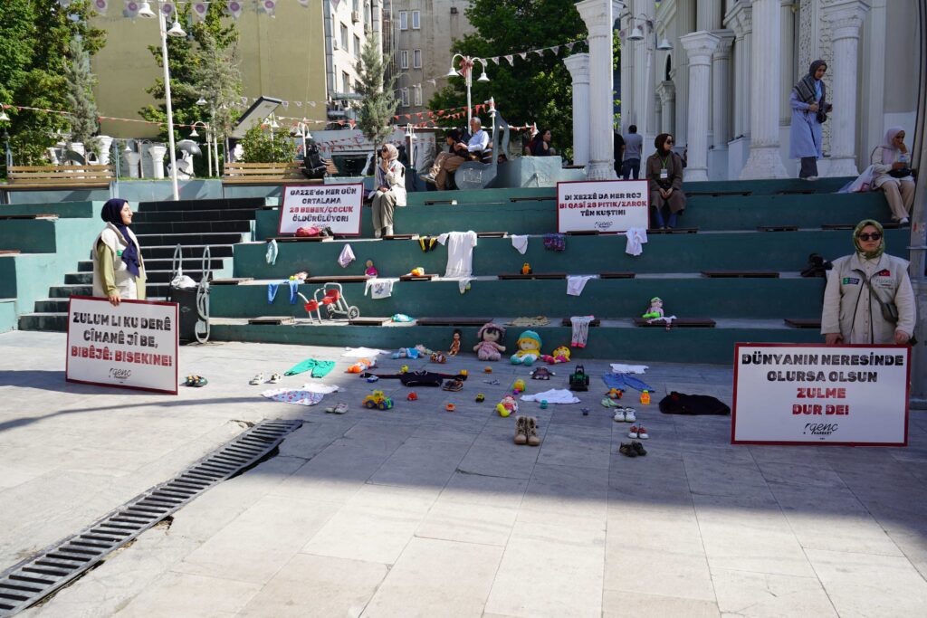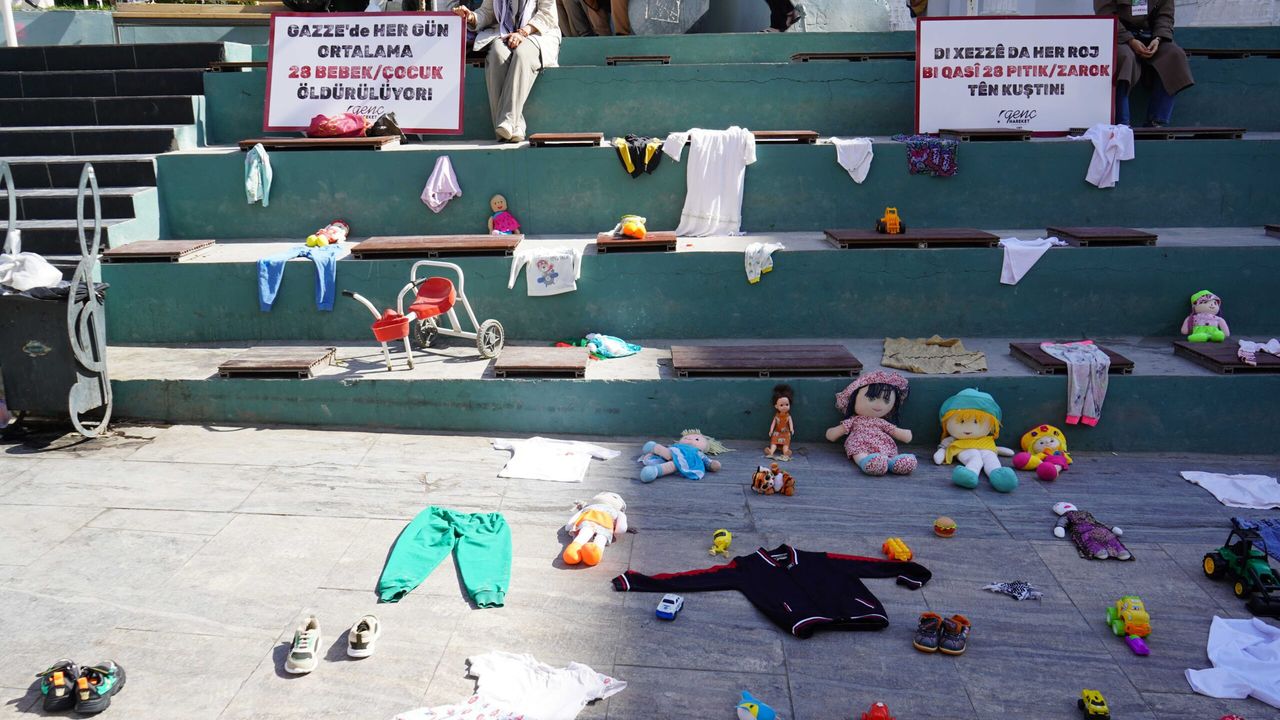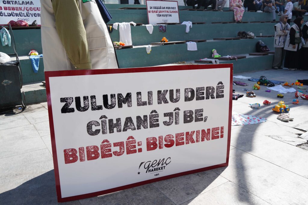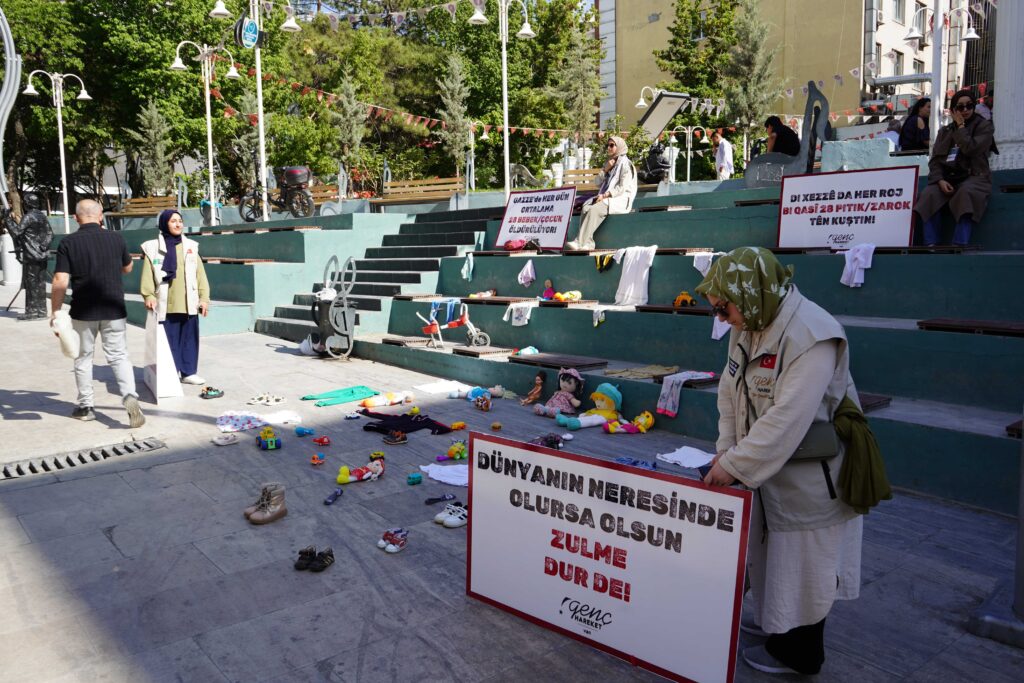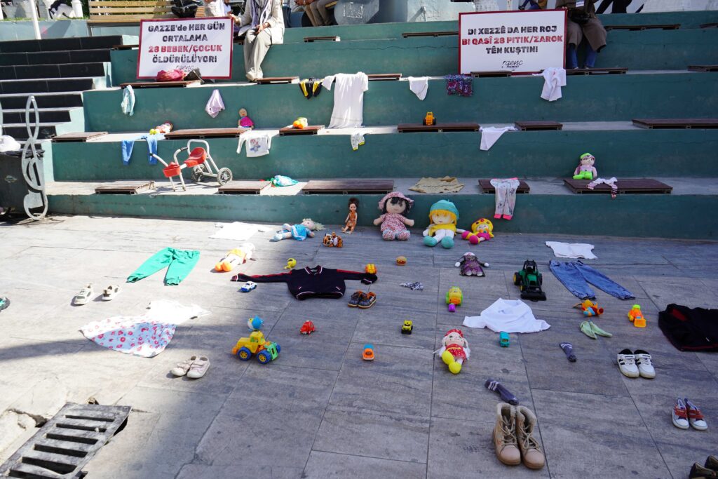 Van’da, İnsan ve Medeniyet Hareketi öncülüğünde anlamlı bir farkındalık etkinliği düzenlendi. Sanat Sokağı’nda gerçekleştirilen etkinlikte, İsrail’in Gazze’de gerçekleştirdiği saldırılar sonucu hayatını kaybeden çocuklara dikkat çekmek amacıyla zarar görmüş çocuk kıyafetleri, kırık oyuncaklar ve minik ayakkabılar sergilendi. Ayrıca alana yapılan soykırımı anlatan Kürtçe ve Türkçe dövizler bırakıldı.