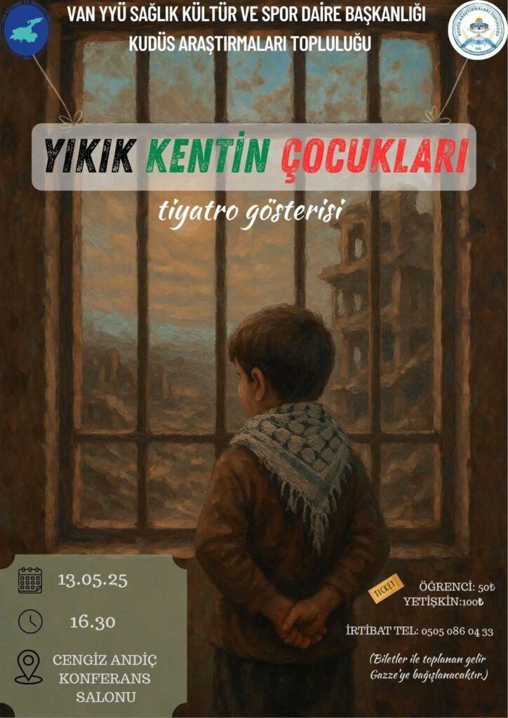 Sanat yoluyla toplumsal farkındalık oluşturmayı hedefleyen etkinlikte, savaşın çocuklar üzerindeki yıkıcı etkileri sahneye taşınacak. Kudüs Araştırmaları Topluluğu tarafından organize edilen tiyatro oyunu, izleyicilere duygusal anlar yaşatmayı amaçlıyor.