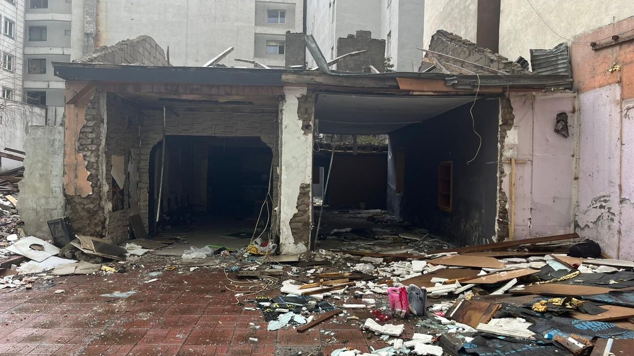 Yeni yıkıldığı belirtilen tek katlı yapının enkazının, yaya trafiğinin yoğun olduğu alana kadar yayıldığı görüldü. Modern binaların arasında kalan yıkım sahasında güvenlik şeridi veya uyarı levhasının bulunmaması ise dikkat çekti.