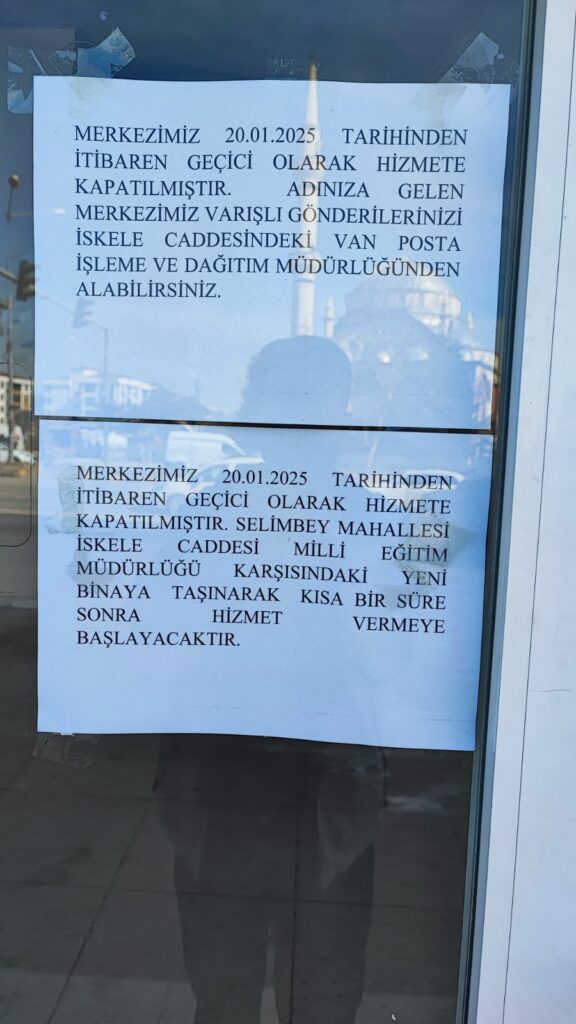 Şube camlarına asılan duyuruda, "Merkezimiz 20.01.2025 tarihinden itibaren geçici olarak hizmete kapatılmıştır. Adınıza gelen merkezimiz varışlı gönderilerinizi İskele Caddesi’ndeki Van Posta İşleme ve Dağıtım Müdürlüğü’nden alabilirsiniz. Selimbey Mahallesi İskele Caddesi Milli Eğitim Müdürlüğü karşısındaki yeni binaya taşınarak kısa bir süre sonra hizmet vermeye başlayacaktır." ifadelerine yer verildi.