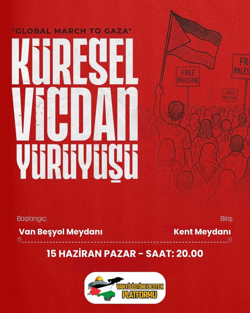 Van Filistin’e Destek Platformu, İsrail’in Gazze’ye yönelik saldırılarına karşı başlatılan uluslararası “Küresel Vicdan Yürüyüşü”ne destek vermek amacıyla kentte bir yürüyüş organize edecek.