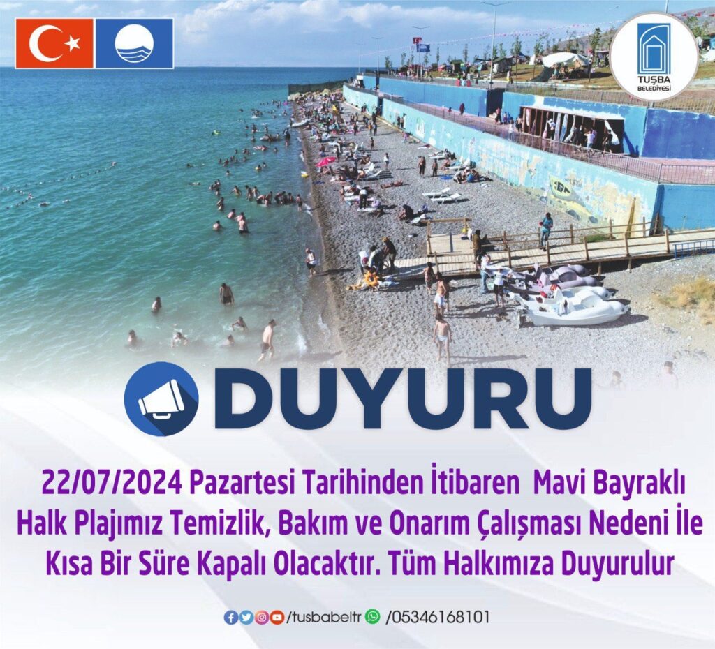 Tuşba Belediyesi tarafından yapılan açıklamada , Van Gölü’ndeki tek mavi bayraklı plaj olan Tuşba Halk Plajının kapatılacağı belirtildi.