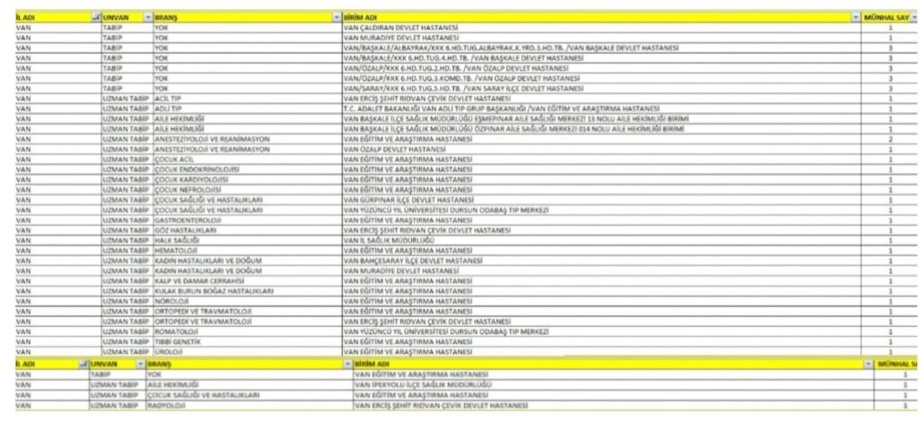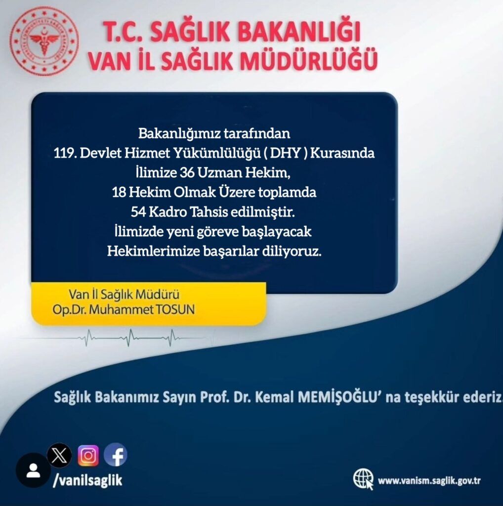 Van İl Sağlık Müdürlüğünün sosyal medya hesabından yapılan açıklamada, “Bakanlığımız tarafından 119. Devlet Hizmet Yükümlülüğü (DHY) kurasında, ilimize 36 uzman hekim, 18 hekim olmak üzere toplamda 54 kadro tahsis edilmiştir. İlimizde yeni göreve başlayacak hekimlerimize başarılar diliyoruz” denildi.