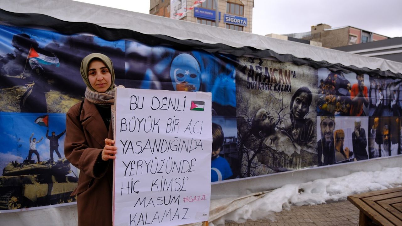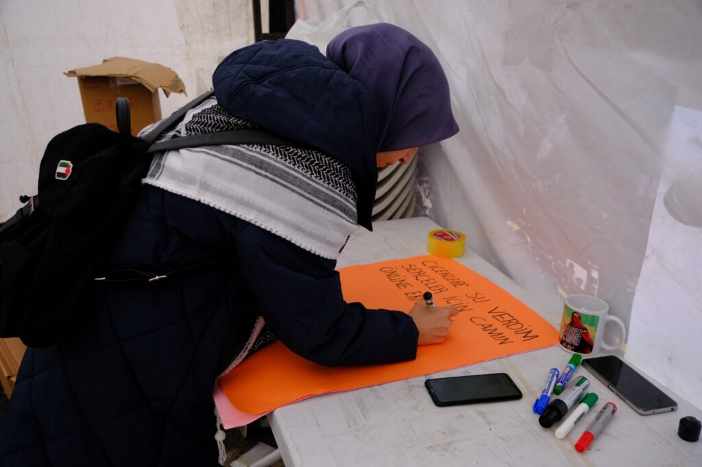 Kendi imkânları ile başlattıkları çalışmalar ile Gazze’de yaşanan soykırımı insanlara hatırlatan Dağ kardeşler, soğuk hava ve yağışlara rağmen Beşyol meydanında çalışmalarını sürdürüyor.