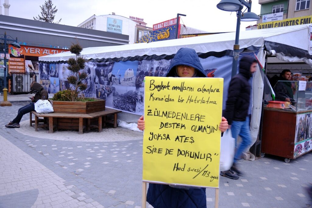 Öğretmen Zeynep Dağ ise kalıcı bir bilincin oluşması için yüreklere dokunulmasını gerektiğini vurgulayarak, “Biz burada bir şeyler yapmaya çalışıyoruz. Yerimizde duramadığımız için sessiz de olsa, dursak ta bir şekilde sesimizi duyurmaya çalışıyoruz. Filistin’in sesini ya da Gazze’nin sesini duyurmaya çalışıyoruz. Bizim burada yaptığımız şey, kartonlarımız var kendimiz marangozdan bir düzenek ayarladık. Onun üstünde her gün değiştirdiğimiz yazıları yazıyoruz. Klasik şeyler değil de daha çok kalbe dokunsun istiyoruz. Bu çünkü duygusal bir şey. Kalbe dokunmadan bir şey olmuyor. Maddi yardım yaptım da kenara çekileyim değil yüreklere işlemeli ki devamı olsun, kalıcı bir bilinç oluşsun. Biz her gün farklı yazılar yazıyoruz, o pankartlarla duruyoruz. Boykotun etkisini artırmaya çalışıyoruz aslında. Kısa süreli olanların bir işe yaramadığını anladık uzun süreli bir şeyler yapmaya çalışıyoruz. Mesela boykotun etkisini anlatmaya çalışıyoruz. Bunun için de ilk boykot nereden çıkmış, başarıya ulaşan boykotlarla ilgili bir yazı hazırladık. O metni veriyoruz bir de duygusal olarak da mektup tarzı bir şey hazırladık.” Onu da ek olarak veriyoruz ve insiyatifin hazırladığı bir boykot rehberi var onu da çıkardık. Onu da veriyoruz.” şeklinde konuştu.