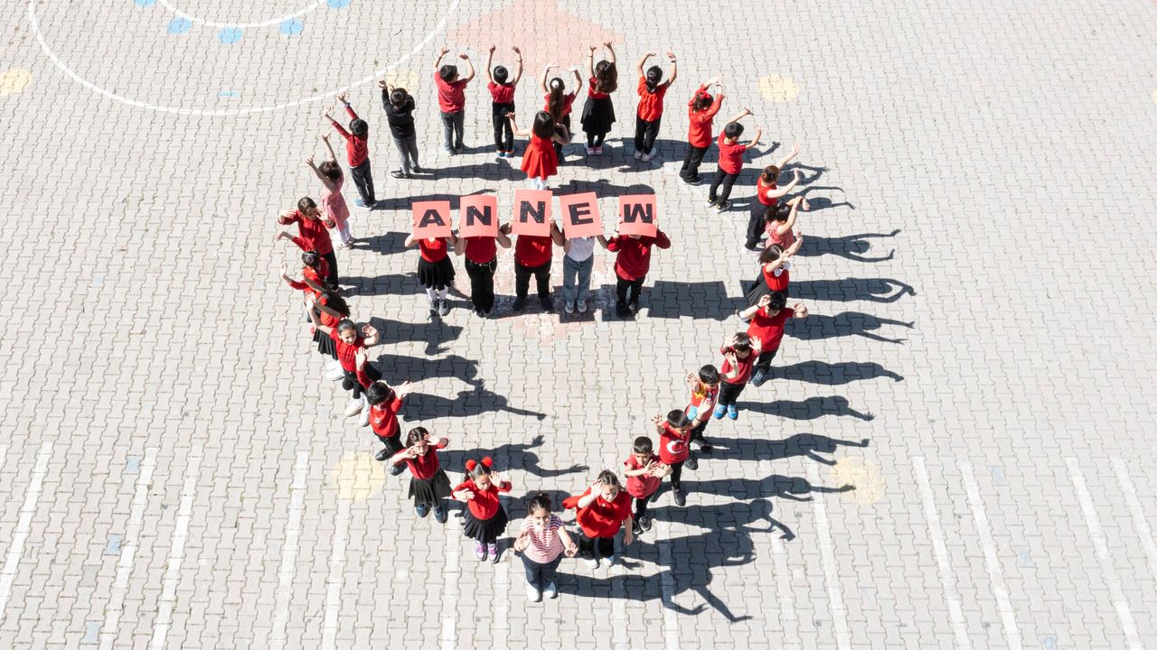 Erciş Reşit Çelik İlkokulu ve Anasınıfı öğrencileri, öğretmenlerinin öncülüğünde okulun bahçesinde kalp kaligrafisi oluşturup kartonlara yazdıkları "Annem" yazıları ile Anneler Günü'nü kutladı.