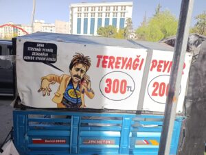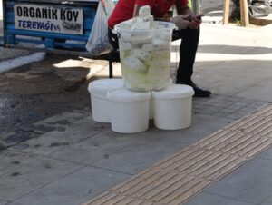 Kent merkezinde trafiğin ve yaya yoğunluğunun fazla olduğu bir noktada satış yapan kişinin aracının üzerinde “Sana tereyağı peynir satacağım hem de uygun fiyata” yazısı yer aldı. Ucuz fiyatlarla dikkat çeken satış noktasında peynirlerin kapaksız kovalar içinde açıkta tutulduğu ve vatandaşların doğrudan elleriyle ürünlere dokunduğu görüldü.