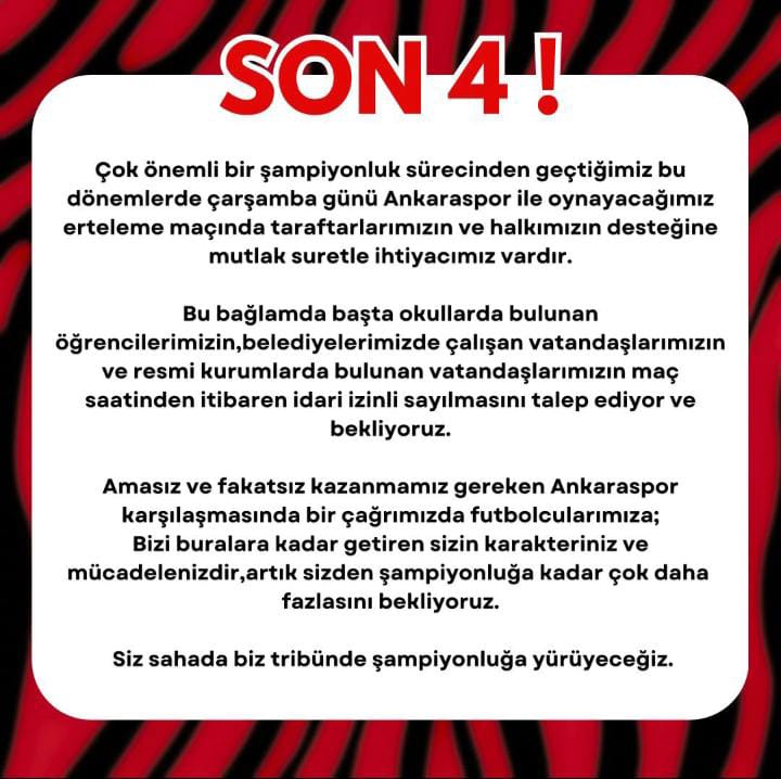 Yapılan paylaşımda, “Çok önemli bir şampiyonluk sürecinden geçtiğimiz bu dönemlerde, çarşamba günü Ankaraspor ile oynayacağımız erteleme maçında taraftarlarımızın ve halkımızın desteğine mutlak suretle ihtiyacımız vardır. Bu bağlamda başta okullarda bulunan öğrencilerimizin, belediyelerimizde çalışan vatandaşlarımızın ve resmi kurumlarda bulunan vatandaşlarımızın maç saatinden itibaren idari izinli sayılmasını talep ediyor ve bekliyoruz. Amasız ve fakatsız kazanmamız gereken Ankaraspor karşılaşmasında bir çağrımız da futbolcularımıza; Bizi buralara kadar getiren sizin karakteriniz ve mücadelenizdir, artık sizden şampiyonluğa kadar çok daha fazlasını bekliyoruz. Siz sahada biz tribünde şampiyonluğa yürüyeceğiz” ifadeleri kullandı.