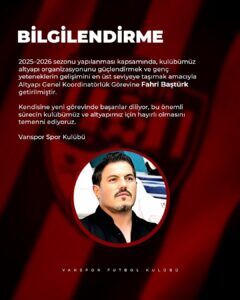 Kulüpten yapılan açıklamada, “2025-2026 sezonu yapılanması kapsamında altyapı organizasyonunu güçlendirmek ve genç yeteneklerin gelişimini en üst seviyeye taşımak amacıyla Fahri Baştürk Altyapı Genel Koordinatörlük görevine getirilmiştir. Kendisine yeni görevinde başarılar diliyor, bu sürecin kulübümüz ve altyapımız için hayırlı olmasını temenni ediyoruz” denildi.