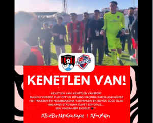 Vanspor taraftarlarına birlik ve beraberlik çağrısı yapılan mesajda, “Kenetlen Van! Kenetlen Vanspor! Bugün evimizde play off’un rövanş maçında karşılaşacağımız 1461 Trabzon Fk müsabakasına takımımızın en büyük gücü olan halkımızı stadyuma davet ediyoruz. Sen yoksa bir eksiyiz. Biz birlikte güçlüyüz” ifadeleri kullanıldı.