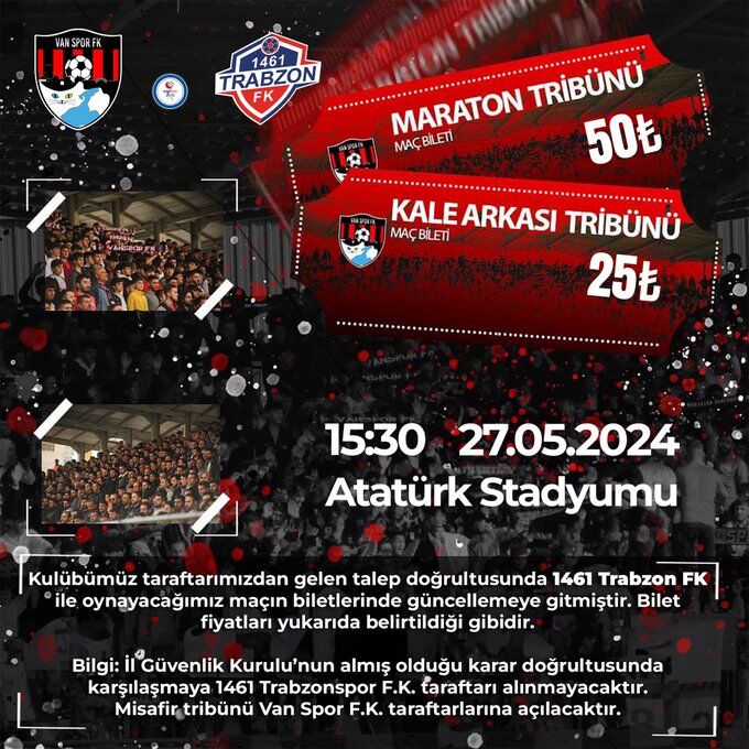 İlk maçta 1461 Trabzon FK, kendi saha ve seyircisi önünde AcnTurk Sigorta Van Spor FK’yi 2 – 0 mağlup etmiş ve avantajı ele geçirmişti. Van İl Spor Güvenlik Kurulu, konuk ekip taraftarlarına ilişkin karar aldı. Kararı Van Spor FK, resmi hesaplarından duyurdu. Alınan karara göre 1461 Trabzon FK taraftarları karşılaşmaya alınmayacak ve misafir takım taraftarları için ayrılan tribün de Van Spor FK taraftarlarına açılacak.maç bilet fiyatlarında da güncelleme yapan Vanspor, maraton tribünü bilet fiyatını 50, kale arkası bilet fiyatını ise 25 TL'ye indirdi.