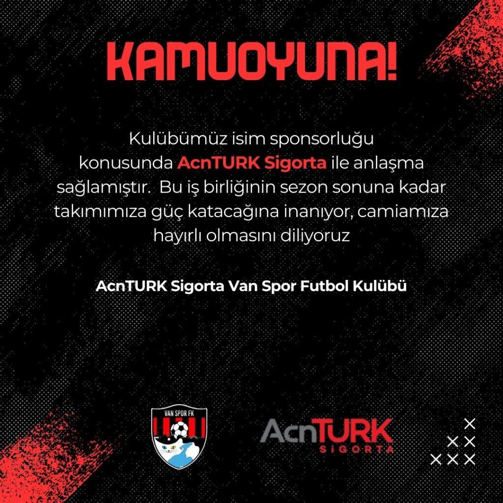 Vanspor Futbol Kulübün'den yapılan açıklamada, "Kulübümüz isim sponsorluğu konusunda AcnTURK Sigorta ile anlaşma sağlamıştır. Bu iş birliğinin sezon sonuna kadar takımımıza güç katacağına inanıyor, camiamıza hayırlı olmasını diliyoruz. AcnTurk Sigorta Vanspor Futbol Kulübü" ifadelerine yer verildi.