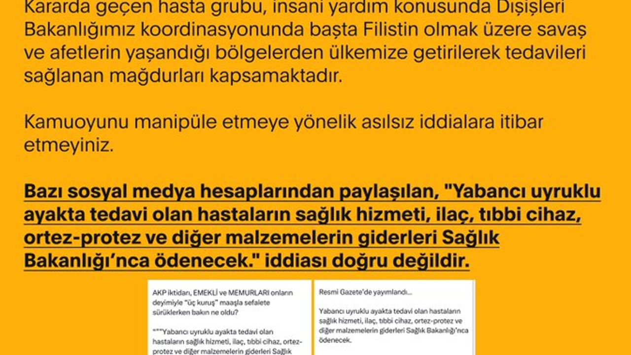 Cumhurbaşkanlığı İletişim Başkanlığı Dezenformasyonla Mücadele Merkezinin, sosyal medya hesabından yapılan açıklamada, "Bazı sosyal medya hesaplarından paylaşılan, ‘Yabancı uyruklu ayakta tedavi olan hastaların sağlık hizmeti, ilaç, tıbbi cihaz, ortez-protez ve diğer malzemelerin giderleri Sağlık Bakanlığı’nca ödenecek’ iddiası doğru değildir. İddiaya konu 8438 sayılı Cumhurbaşkanı Kararının, kamuoyuna yansıtıldığı gibi ülkemizdeki mülteci ya da geçici koruma altındaki kişilerle bir ilgisi yoktur. Kararda geçen hasta grubu, insani yardım konusunda Dışişleri Bakanlığımız koordinasyonunda başta Filistin olmak üzere savaş ve afetlerin yaşandığı bölgelerden ülkemize getirilerek tedavileri sağlanan mağdurları kapsamaktadır. Kamuoyunu manipüle etmeye yönelik asılsız iddialara itibar etmeyiniz" ifadelerine yer verildi.