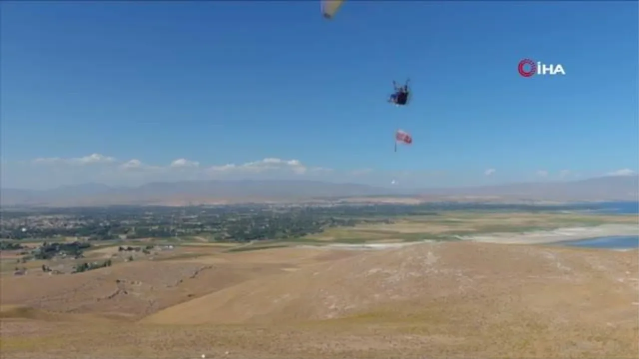 VAN - Van'ın Erciş ilçesinde yamaç paraşütü pilotu baba ve oğul, Erciş'in il olması için Van Gölü semalarında pankart açtılar.