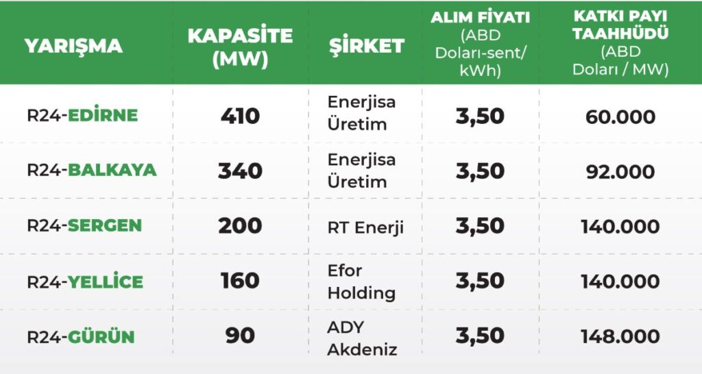 Tüm yarışmalarda daha önce belirlenen kilovatsaat başına 3,50 dolar-sent’lik taban fiyata inilirken yarışmalarda en iyi teklifleri veren şirketler şöyle: