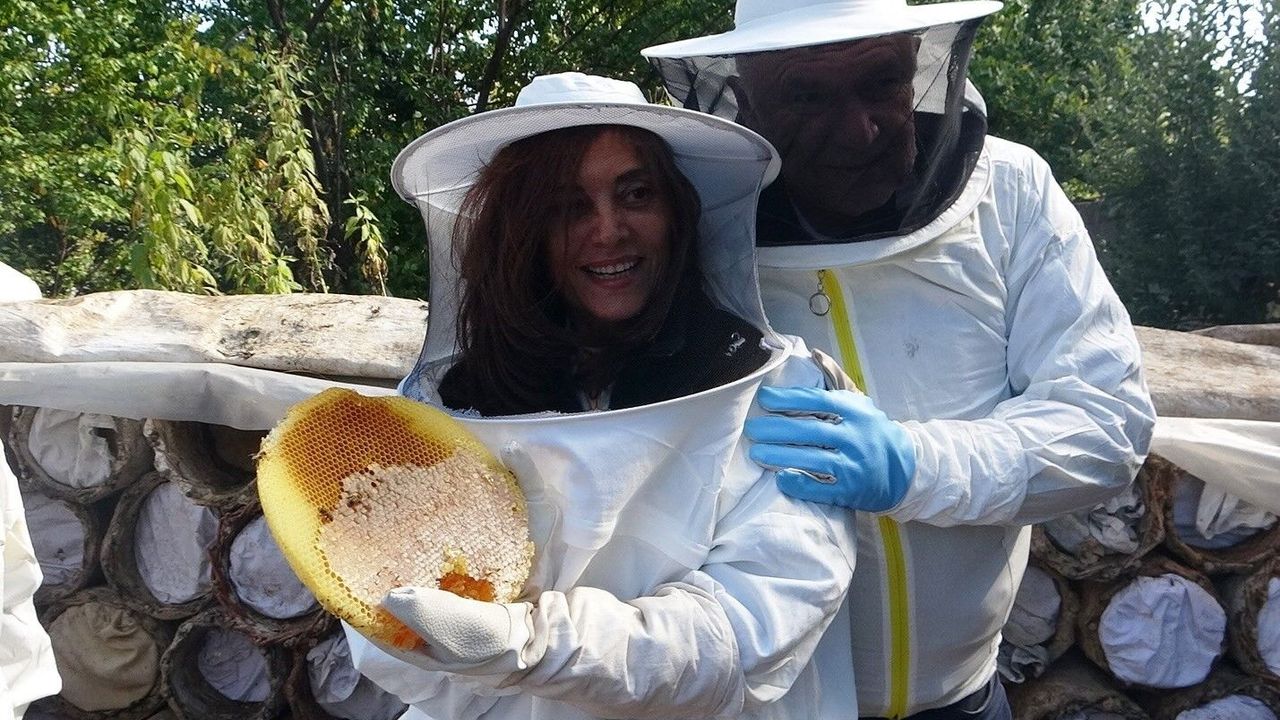 Tur şirketi aracılığıyla İstanbul’dan Van’a gelen yerli turistler, bir arıcının üretim sahasında, önce özel kıyafetler giydi, ardından da kovanlardan bal topladı. Yıllardır Van’da karakovan balı üreten Ömer Akbulak’ın bahçesinde organik balı hem tatma hem de yerinde görme imkanı bulan yerli turistler, arıcı kıyafeti giyip kovanların bulunduğu alanda bal hasadı yaptı.