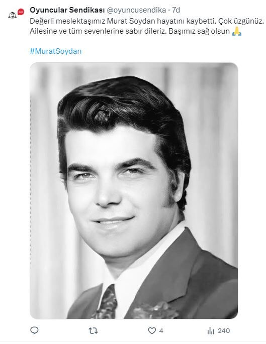 Oyuncunun eşi Uğurgül Soydan ise acısını, "Çok değerli 43 yıllık eşim Türk sinemasının kıymetli sanatçısı Murat Soydan'ı kaybettik. Ailemizin ve sevenlerinin başı sağ olsun" sözleriyle dile getirdi.