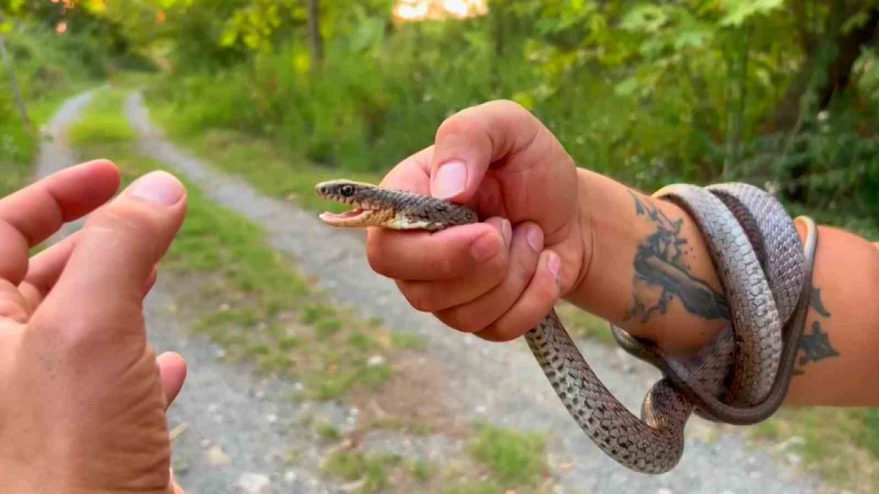 Kemal Başer, elleriyle yakaladığı yılan hakkında bilgi vererek, "Şimdi eve girmiş, mutfakta yakalandı zaten bir yılan eve geliyorsa evin çevresinde geziyorsa o bölgede besleneceği bir canlı vardır. Özellikle fareler için gelir farenin kokusunu alır, onu avlamaya gider, yılan gezen yere fare gelmez. Farenin olduğu yere de yılan gelir öyle söyleyeyim. Bu da yakalamış zaten bunu yakalandığında karnına baktım, yeni beslenmiş dedim en az da bir tane yemiştir dedim ve yılanı yakalayıp çuvala koydum. Doğaya bırakmak için getirirken hayvan strese girmiş fareleri çıkartmış. İki tane fare çıkartmış düşündüğüm gibi iki tane yemiş. Şimdi bu zehirsiz bir yılan türü kırbaçgiller familyasından yine karayılan, bozyürük ve hazer yılanı o aileden. Kırmızı yılan dediğim bir türden. Agresif bir türdür saldırma eğilimi gösterir o da kendini korumak için yapıyor bunu zehir dişleri olmadığından. Şimdi bunu da yakaladık kurtardık doğaya salacağız birazdan. Yılanlar doğamız ve ekosistem için önemli canlılardır yılan türlerinin tanınmasını istiyorum. Yakaladığım yılanları tanıtmaya yönelik görsellerini paylaşıyorum her yılan zehirli değildir. Bunların doğada gerçekten çok önemli görevleri var. Bunlar biz görmeden doğada birçok noktada kemirgenleri yiyor. Bir dengeyi sağlıyor bunu bilmemiz lazım" ifadelerini kullandı.