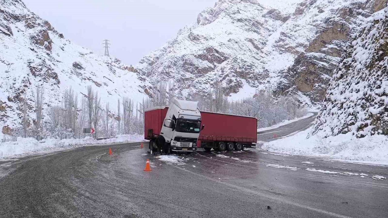 Erzurum’un Tortum ilçesi Derekapı mevkisinde Trabzon’dan İran’a gitmekte olan İran plakalı bir tır, buzlanma nedeniyle virajı alamayarak ters şeride dönüp makasladı.