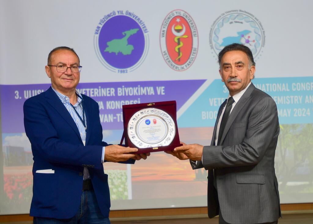 Emekli Öğretim Üyemiz Prof. Dr. Nihat Mert’e, Veteriner Fakültesi Dekanı Prof. Dr. Musa Gençcelep tarafından plaket takdim edilirken kongre katılımcılarından İstanbul Üniversitesi Biyokimya Anabilim Dalı üyeleri tarafından da kendisine hediye takdiminde bulunuldu.